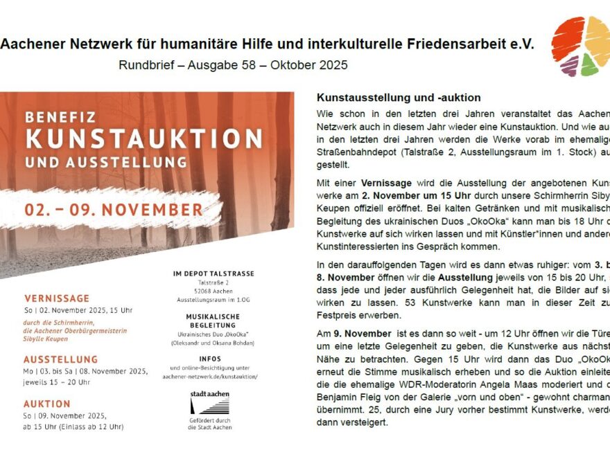 Natürlich hat der letzte Rundbrief vor unserer Kunstauktion genau diese als Schwerpunkt. Das Programm und alle Kunstwerke werden dort auf 44 Doppelseiten vorgestellt. Auf unserer Webseite kann man seit diesem Montag schon auf 25 Kunstwerke bieten – und über 50 andere direkt kaufen. Besser ist natürlich, wenn man sie vorher „in echt“ sieht – ab 2. November für eine Woche im ehemaligen Aachener Straßenbahndepot an der Talstraße! Dort ist auch am 9. November die Auktion. Im Rundbrief unter Aachener_Netzwerk_Newsletter_202510.pdf könnt ihr aber jetzt schon mal rein schnuppern. Wir freuen uns, euch bei der Vernissage, in der Ausstellung und bei der